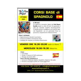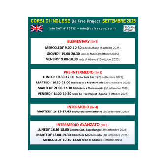 - Se il corso scelto viene confermato dalla Be Free Project il saldo va effettuato entro il 20 settembre