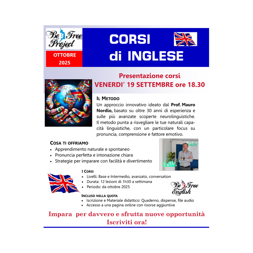 Be Free English© è un metodo per imparare l’inglese per davvero, con una metodologia efficace e naturale. Il materiale di studio, (le dispense, gli esercizi, gli audio) segue il metodo creato dal Prof. Nordio. Approfondimenti di fonetica e molta attenzione alla pronuncia a corollario del percorso formativo. Non solo un classico insegnante, nel Prof. Nordio si troverà un vero "English Trainer" che seguirà i progressi di tutti gli allievi, anche dei corsi collettivi, e li motiverà a progredire mediante specifici consigli e indicazioni. Non perdere questa occasione di crescita personale, grazie alle opportunità private e professionali che derivano dalla buona conoscenza dell’inglese.