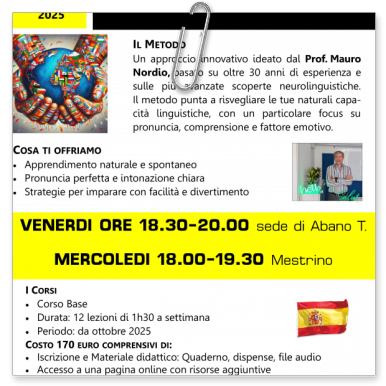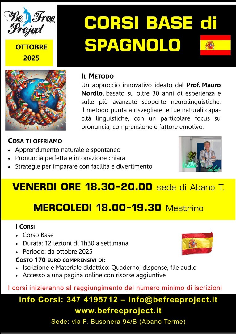“Be Free Español”© è un metodo per impararelo Spagnolo in maniera veramente efficace. Il materiale di studio, (le dispense, gli esercizi, i CD audio) segue il metodo creato dal Prof. Nordio. Non solo un classico insegnante, nel Prof. Nordio si troverà un vero " Trainer" che seguirà i progressi di tutti gli allievi, anche dei corsi collettivi, e li motiverà a progredire mediante specifici consigli e indicazioni. Non perdere questa occasione di crescita personale, grazie alle opportunità private e professionali che derivano dalla buona conoscenza dello Spagnolo.