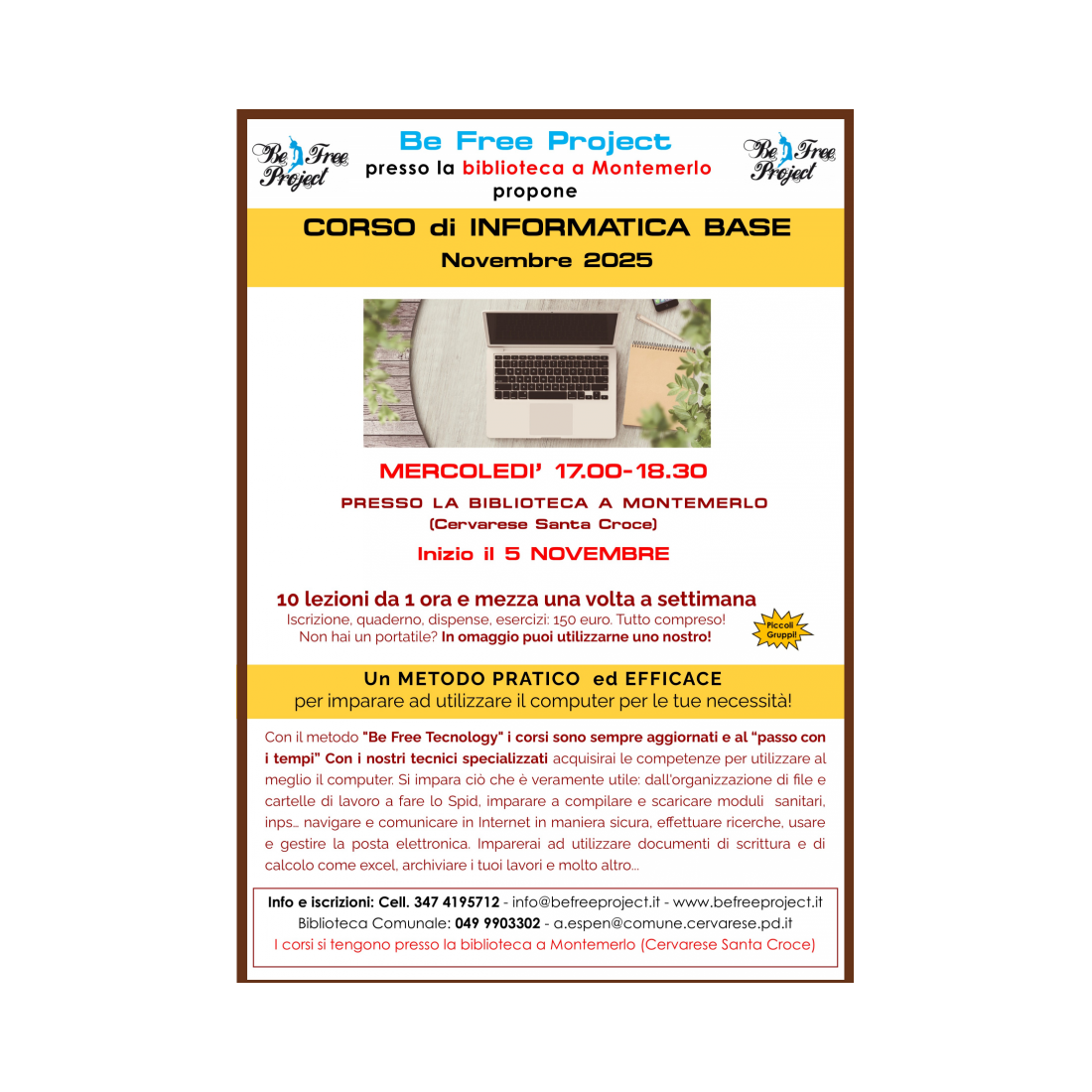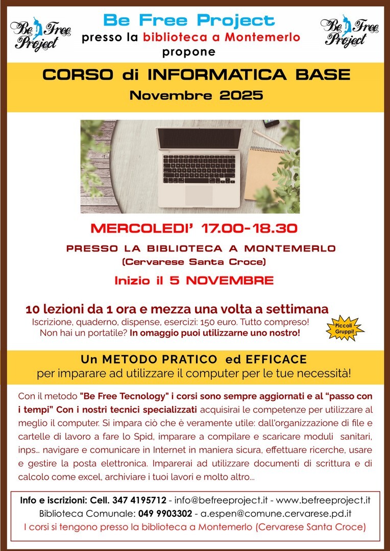è rivolto a tutti, ed è consigliato a chi non ha dimestichezza con l'utilizzo del computer e dei sistemi di posta elettronica. Hai ricevuto informazioni in maniera sporadica e fai da te? Con il metodo "Be Free Technology" acquisirai le competenze di base per utilizzare al meglio il computer. Si impara ciò che è veramente utile: dall'organizzazione di file e cartelle di lavoro a navigare e comunicare in Internet in maniera sicura, effettuare ricerche, usare e gestire la posta elettronica. Imparerai ad utilizzare documenti di scrittura e di calcolo come Excel, mettere in salvo i tuoi lavori, ecc …